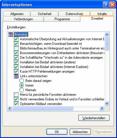 7. Erweitert: Hier gibt es viele Sachen zum Verstellen (ich meine natürlich einstellen). Wichtig für Sie ist nur zu wissen, dass wenn eine Seite mal nicht richtig funktioniert, der Button wiederherstellen es in Ordnung bringen kann. Würde ich auf alle Punkte eingehen wären es auch keine Grundkenntnisse mehr.